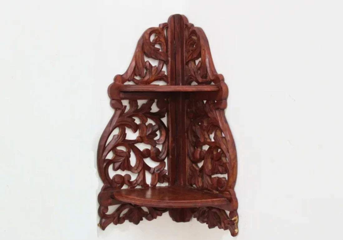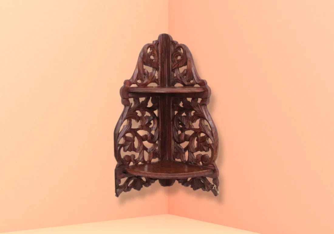 The Beautifully Hand-Carved Wooden Wall Corner is a magnificent piece of artistry and craftsmanship that enhances the aesthetics of your living space while maximizing corner spaces. This wall-mounted corner unit is meticulously hand-carved from wood, creating intricate designs and patterns that showcase the artisan's dedication to detail and creativity.