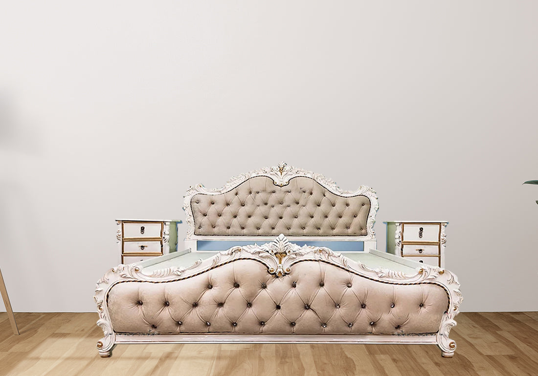 The bed set includes complementary pieces that resonate with the same European flair. From nightstands to dressers, each piece carries the same attention to detail and design principles, creating a cohesive and visually pleasing bedroom ensemble.