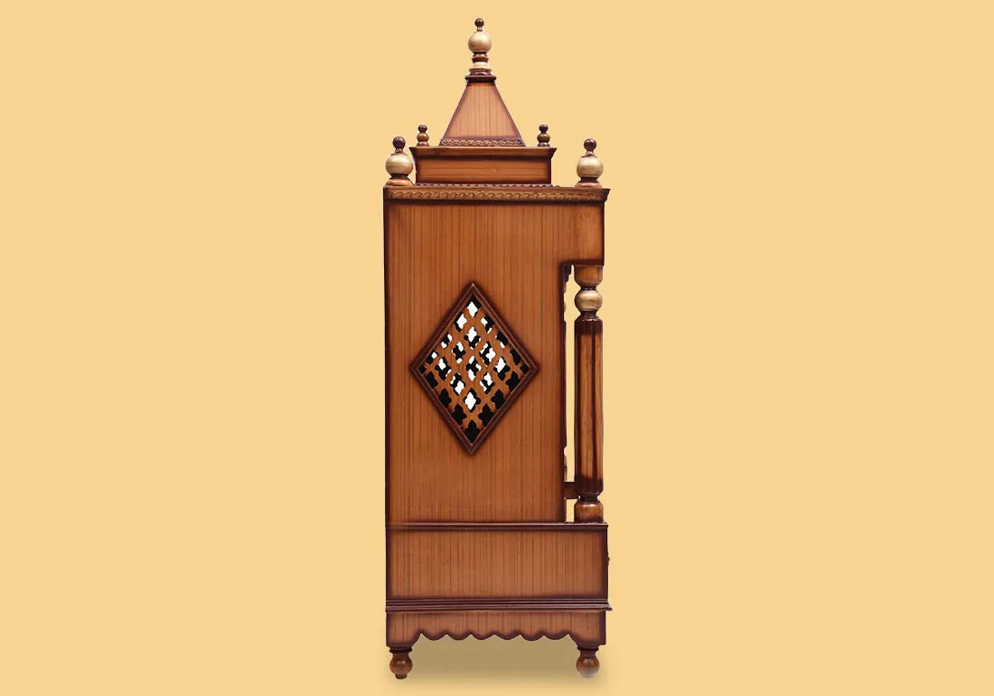 The intricate hand-carving on this temple is a testament to the artisan's dedication to detail. Traditional motifs and designs inspired by Indian temple architecture adorn the temple's facade, creating an aura of sacredness and reverence. The wooden structure, often made from premium materials such as teak or rosewood, exhibits rich, natural tones and distinct grain patterns, adding warmth and character to your living space.