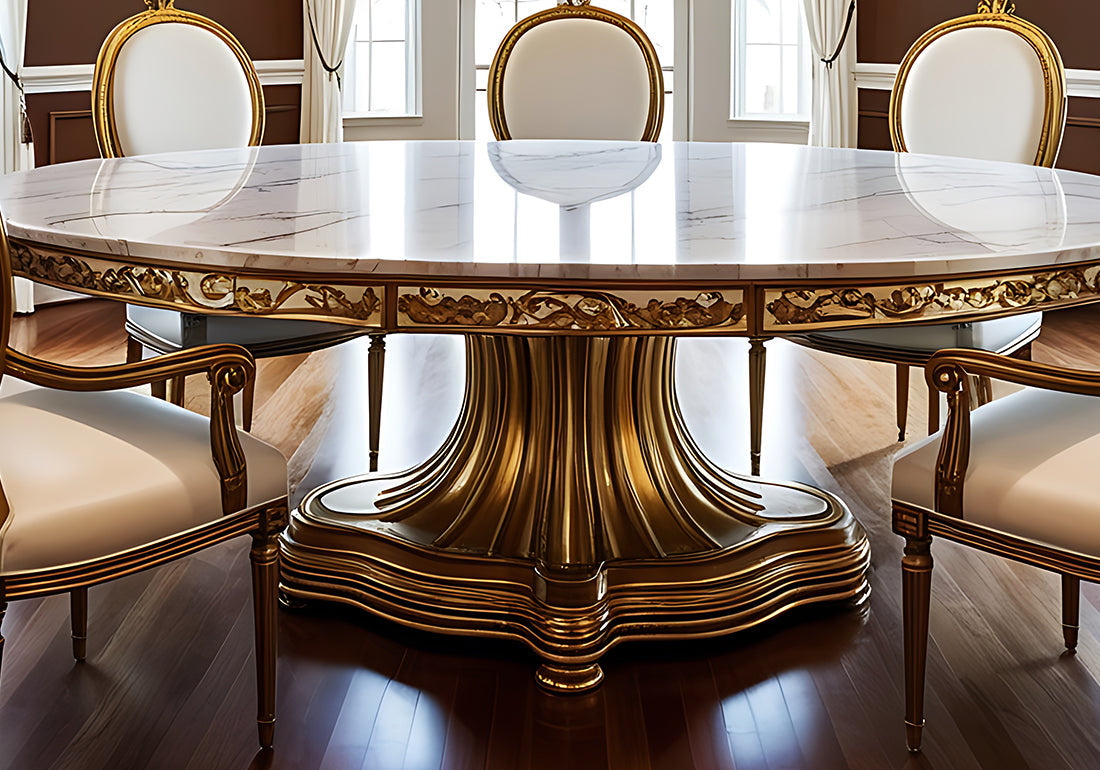 The marble-finished tabletop radiates charm and luxury, while the upholstered chairs, with their classic medallion backs and gold accents, offer comfort as refined as their design. Ideal for both intimate meals and grand celebrations, this round dining set transforms every gathering into a royal experience.