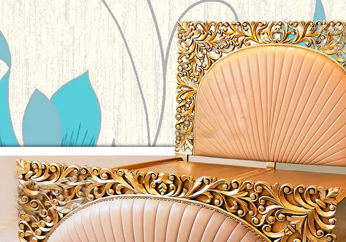 Your bedroom will become a refuge of luxury and style thanks to this Leatherette Royal Bed with Golden Finish. It is more than just furniture; it is a manifestation of exquisite aesthetics and a celebration of the beauty of natural materials. Discover the allure of the teak wood's beautiful grains as well as the allure of superb design, which combine to give you evenings of cozy sleep in a space of timeless beauty.