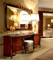 The Brown Luxury Hand-Carved Dressing Table features a large central mirror, framed by intricately carved borders that reflect the harmonious blend of traditional and contemporary design. The mirror itself offers a clear and distortion-free reflection, allowing you to perfect your look with ease.