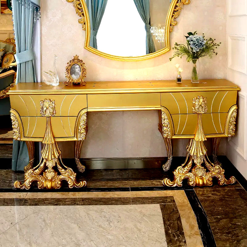 Introducing the epitome of opulence and elegance, behold the Gold Luxury Hand Carved Dressing Table. This masterfully crafted piece of furniture is a true testament to exquisite artistry and timeless beauty.