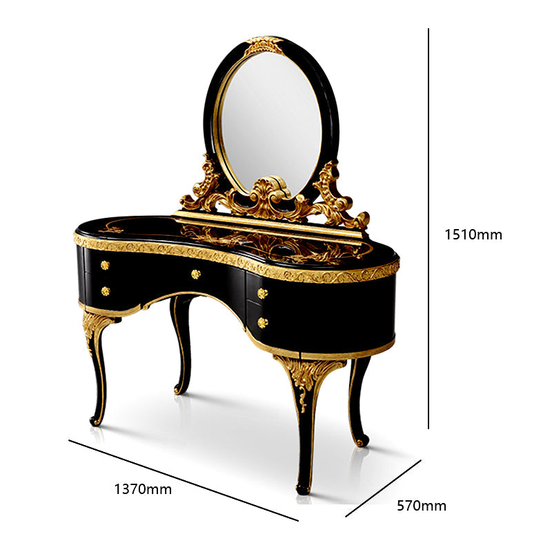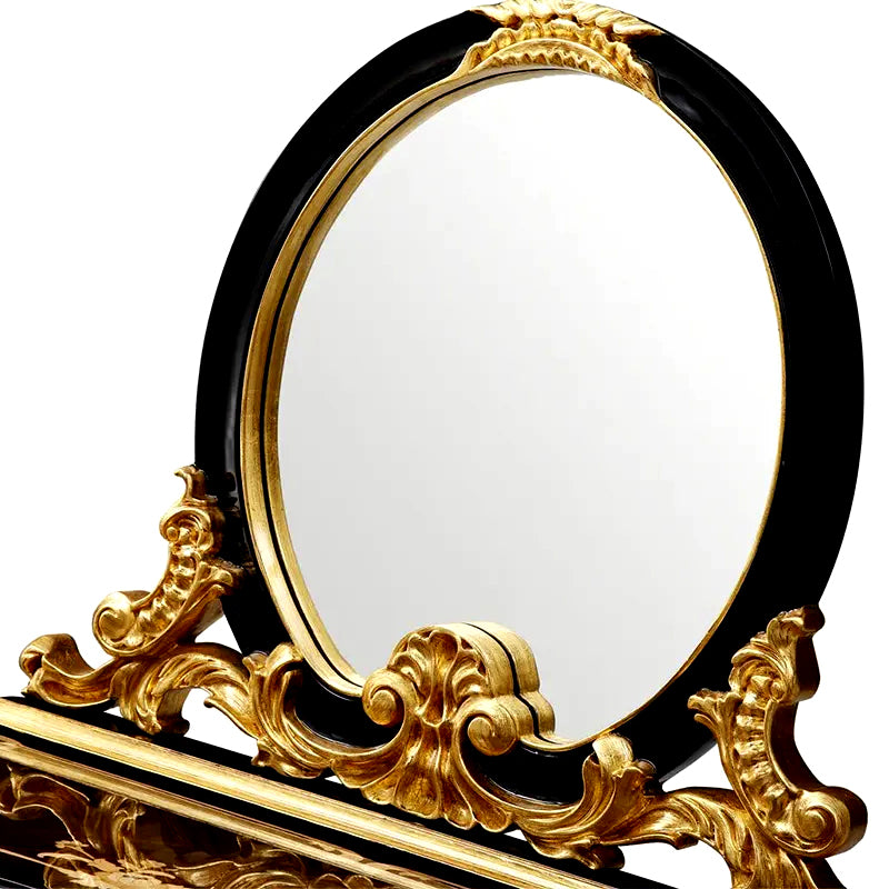 The dressing table features a spacious tabletop, providing ample space for your beauty essentials and personal belongings. A stunning, ornate mirror graces the top, surrounded by decorative accents that further enhance its grandeur. The mirror is carefully designed to offer a clear and flattering reflection, allowing you to effortlessly perfect your makeup or style your hair.