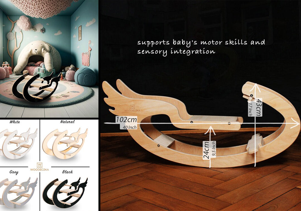 Introducing the enchanting Woodland Wonder Rocking Horse, a captivating blend of timeless elegance and modern design. Crafted with meticulous care, this exquisite kids' toy captures the essence of classic playtime with a contemporary twist.