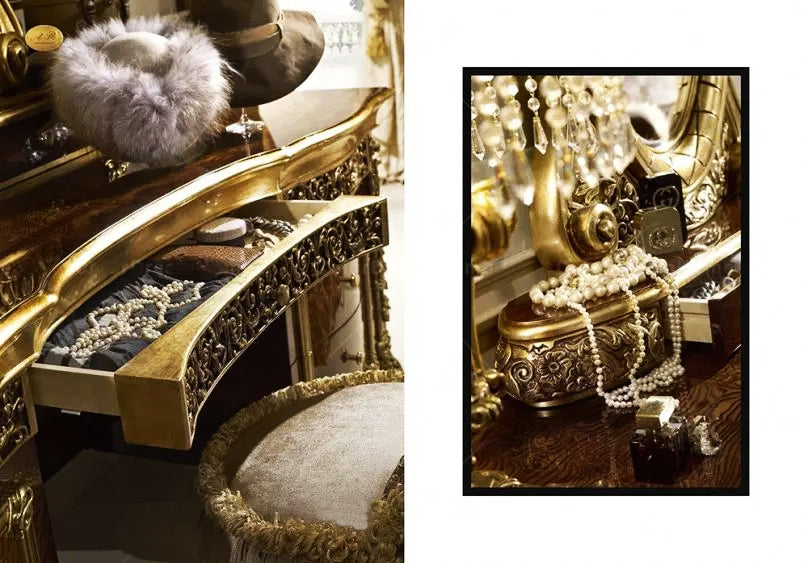 Our Gold Solid Teakwood Carving Dressing Table transcends the ordinary, elevating your interior decor to new heights of luxury and sophistication. It serves as a focal point that captures attention and evokes a sense of refined beauty. Immerse yourself in the indulgence of this exceptional piece, where craftsmanship, elegance, and functionality seamlessly blend to create an experience beyond compare.