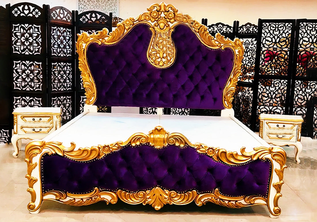 The focal point of this set is the exquisite poster bed frame, handcrafted from premium solid wood. The wood's rich tones and natural grain are showcased through a meticulous finishing process that enhances its beauty. The four intricately carved posters rise from each corner of the bed, adding a sense of height and grandeur to the room.