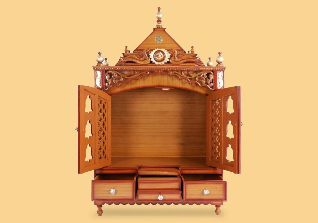 A unique hand-carved teak wooden temple is a remarkable fusion of artistic craftsmanship and spiritual sanctity. Crafted by skilled artisans, this temple stands out as a one-of-a-kind masterpiece, showcasing intricate and mesmerizing carvings that tell a story of devotion and heritage.