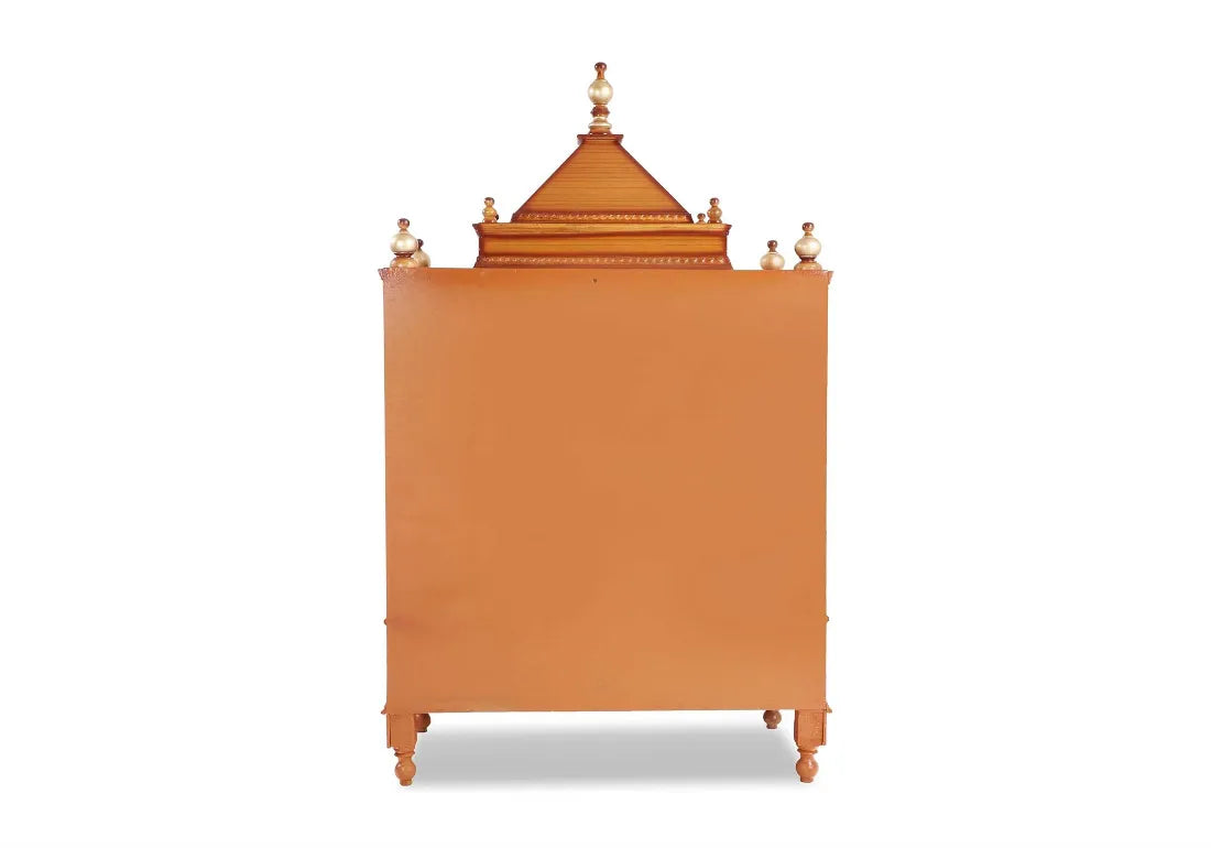 Inside the temple, you'll find shelves and compartments thoughtfully designed to accommodate religious idols, prayer essentials, and sacred artifacts. The teak wood's natural warmth and beauty permeate the interior, creating a serene and contemplative ambiance. This unique hand-carved teak wooden temple is not just a piece of furniture; it's a spiritual sanctuary and a symbol of devotion, culture, and the exceptional skill of its creators. It stands as a testament to the enduring tradition of craftsmanship and serves as a centerpiece of reverence and elegance in any home.